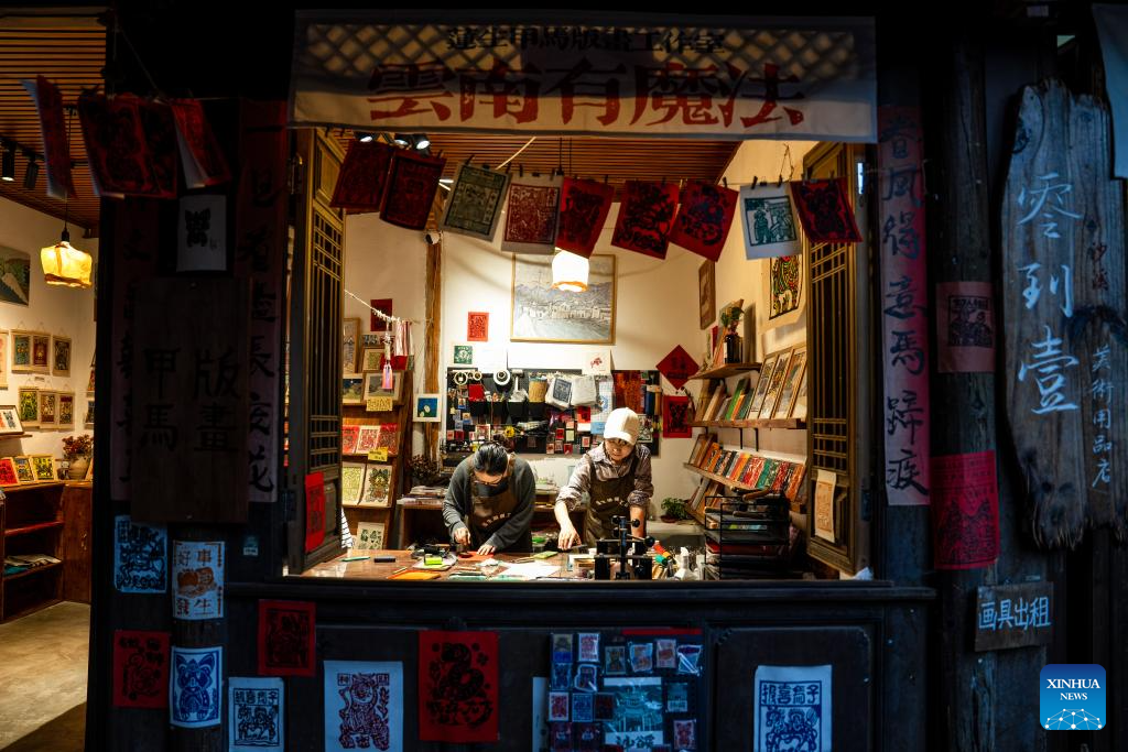 Una turista (izq.) intenta hacer un grabado tradicional en madera conocido como Jiama en la aldea de Sideng de la localidad de Shaxi, en el distrito de Jianchuan, provincia suroccidental china de Yunnan, el 18 de abril de 2025. Shaxi, una remota localidad del distrito de Jianchuan, fue antaño un importante centro de comercio de té, hierbas, sedas y sal en la antigua Ruta de los Caballos del Té, una ruta comercial que se remonta a la dinastía Tang (618-907). (Xinhua/Hu Chao.)