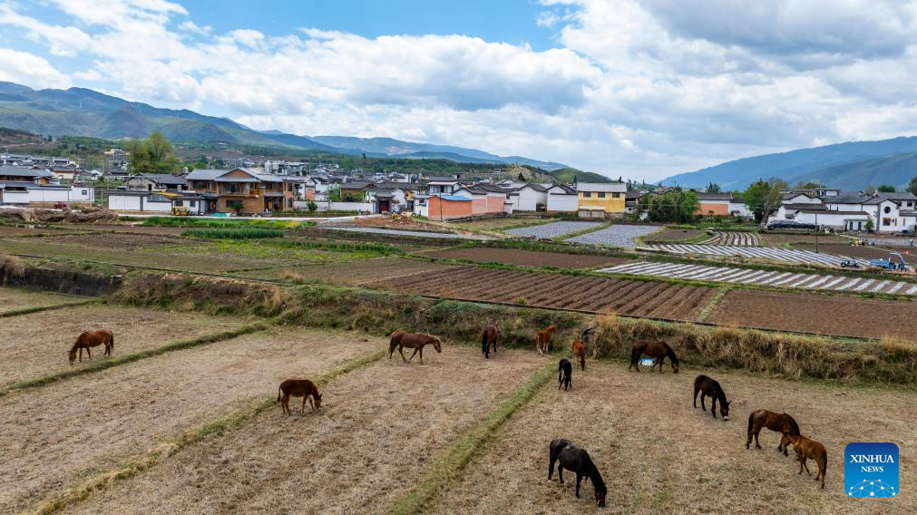 Una fotografía aérea tomada por un dron el 20 de abril de 2025 muestra caballos en una zona de forrajeo en la aldea de Sideng de la localidad de Shaxi, en el distrito de Jianchuan, provincia suroccidental china de Yunnan. (Xinhua/Liu Lianfen.)