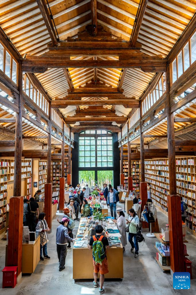 Un grupo de personas visita una librería en la aldea de Beilong de la localidad de Shaxi, en el distrito de Jianchuan, provincia suroccidental china de Yunnan, el 20 de abril de 2025. (Xinhua/Liu Lianfen.)