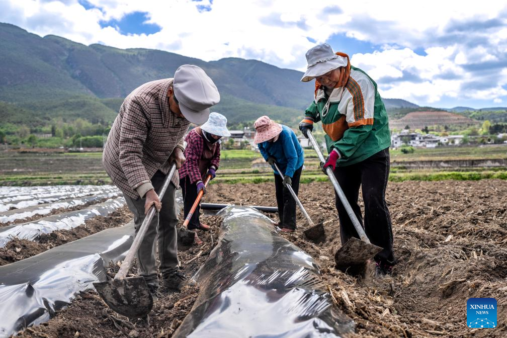 Aldeanas trabajan en el campo en la aldea de Beilong de la localidad de Shaxi, distrito de Jianchuan, provincia suroccidental china de Yunnan, el 20 de abril de 2025. (Xinhua/Liu Lianfen.)