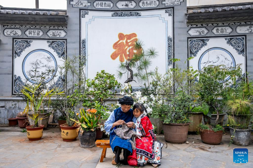 Una anciana de la etnia bai teje en su residencia de la aldea de Sideng, en la localidad de Shaxi, distrito de Jianchuan, provincia suroccidental china de Yunnan, el 20 de abril de 2025. (Xinhua/Hu Chao.)