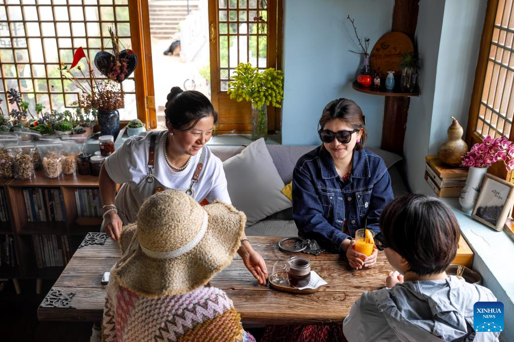Una aldeana sirve café a los turistas en la aldea de Hualong de la localidad de Shaxi, distrito de Jianchuan, provincia suroccidental china de Yunnan, el 20 de abril de 2025. (Xinhua/Hu Chao.)