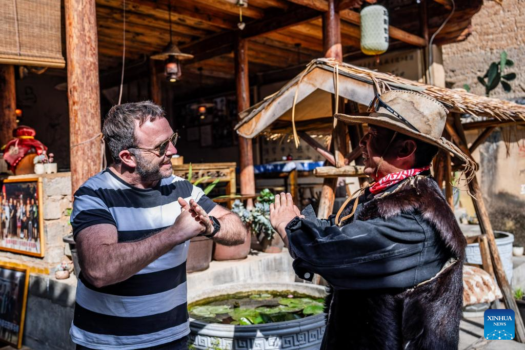 Yang Siyun (dcha.), descendiente de operadores locales de trenes de caballos, se despide de un turista extranjero en la aldea de Sideng de la localidad de Shaxi, en el distrito de Jianchuan, provincia suroccidental china de Yunnan, el 19 de abril de 2025. (Xinhua/Hu Chao.)