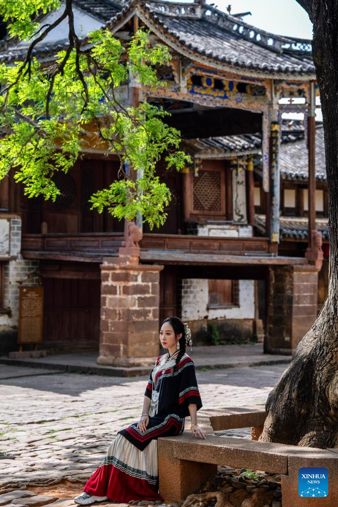 Una turista posa para una foto delante de un antiguo escenario en la aldea de Sideng de la localidad de Shaxi, en el distrito de Jianchuan, en la provincia suroccidental china de Yunnan, el 21 de abril de 2025. (Xinhua/Hu Chao.)