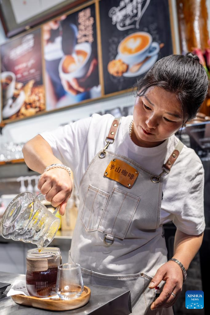 Una aldeana prepara café en la aldea de Hualong de la localidad de Shaxi, distrito de Jianchuan, provincia suroccidental china de Yunnan, el 20 de abril de 2025. (Xinhua/Hu Chao.)