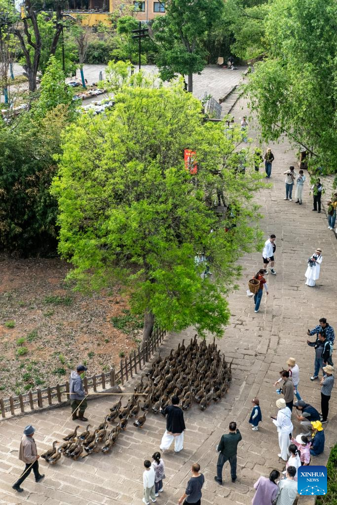 Una fotografía aérea tomada por un dron el 19 de abril de 2025 muestra a unos aldeanos conduciendo una bandada de patos en el pueblo de Sideng, en la localidad de Shaxi, distrito de Jianchuan, provincia suroccidental china de Yunnan. (Xinhua/Hu Chao.)
