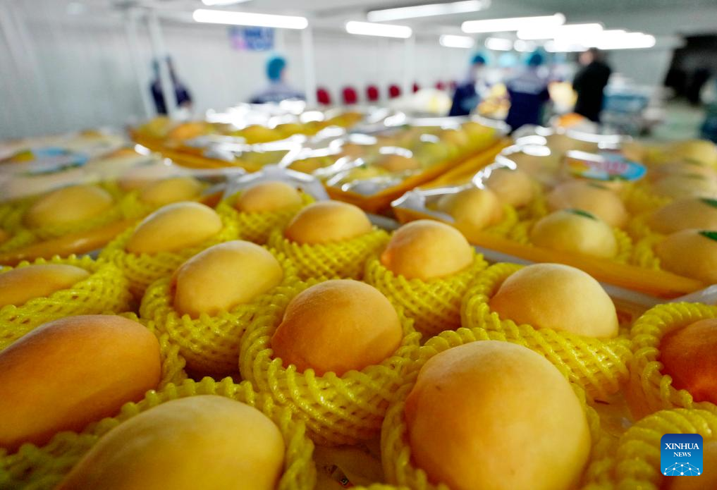 Los melocotones recién cosechados se muestran en el distrito de Changli, provincia de Hebei, en el norte de China, el 26 de abril de 2025. (Xinhua/Yang Shiyao.)