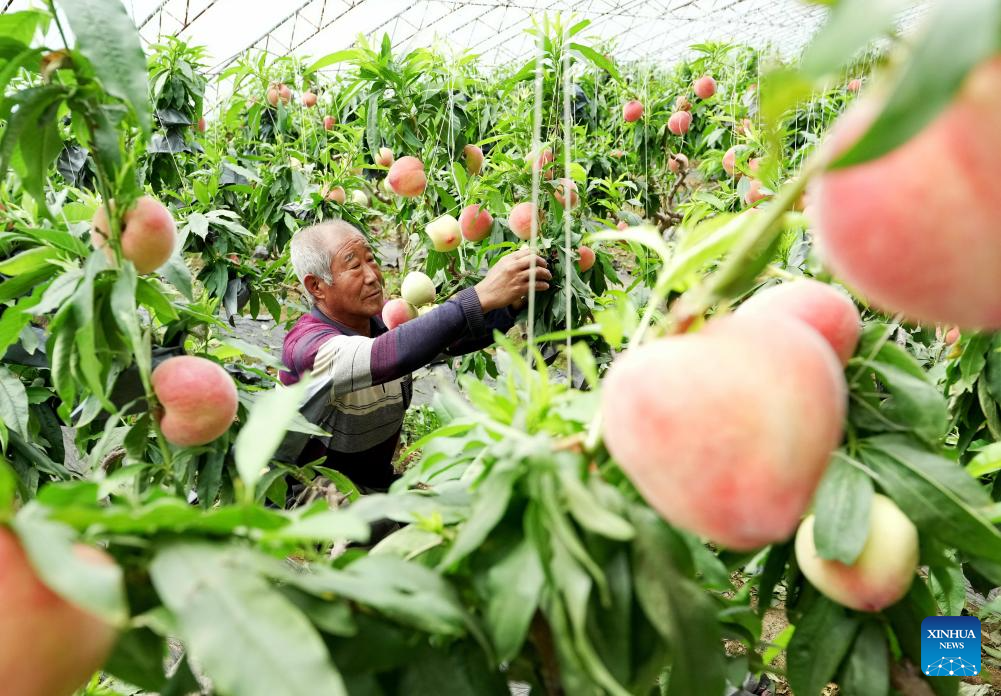 Un agricultor cuida melocotones en un invernadero en el distrito de Changli, provincia de Hebei, en el norte de China, el 26 de abril de 2025. (Xinhua/Yang Shiyao.)