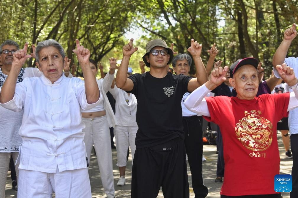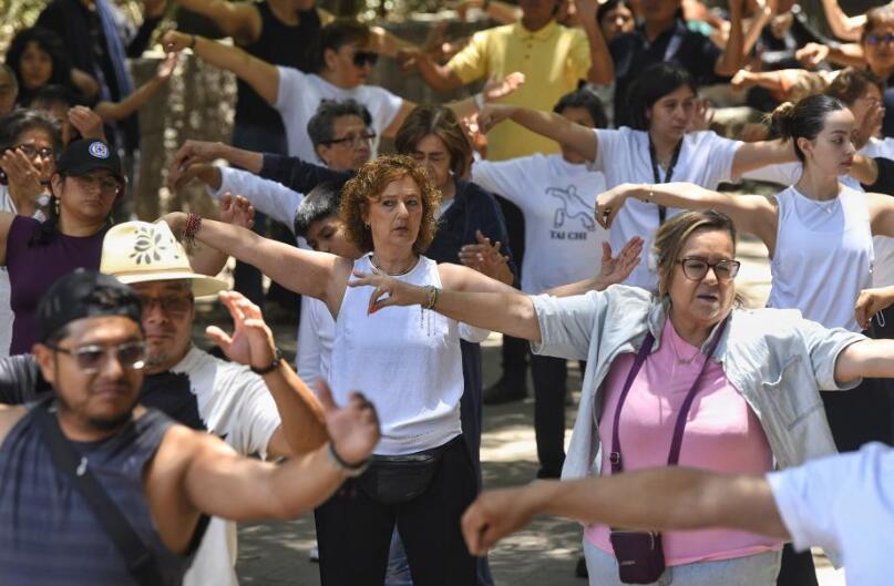 Personas participan en la clase "Unete al Movimiento: Tai Chi Contigo Día Mundial del Tai Chi 2025" convocada por el Centro Cultural de China en México en el marco del Día Internacional del Tai Chi en el Zoológico de Chapultepec, en la Ciudad de México, capital de México, el 27 de abril de 2025. (Xinhua/Octavio Gómez)