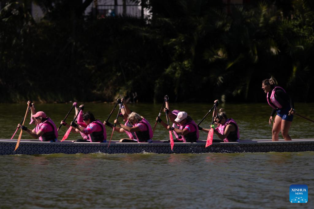 Imagen del 26 de abril de 2025 de personas participando en una competencia de Botes del Dragón, en Avellaneda, Argentina. (Xinhua/Martín Zabala)
