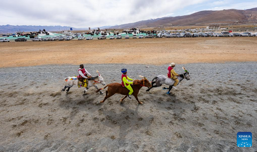 Jinetes compiten durante un evento de carreras de caballos por invitación, en el distrito de Damxung, en la región autónoma de Xizang, en el suroeste de China, el 27 de abril de 2025. El evento se celebra del 23 al 28 de abril en el hipódromo del distrito de Damxung con la participación de 403 caballos, que participarán en 12 competiciones entre carreras de resistencia y velocidad. (Xinhua/Tenzin Nyida)