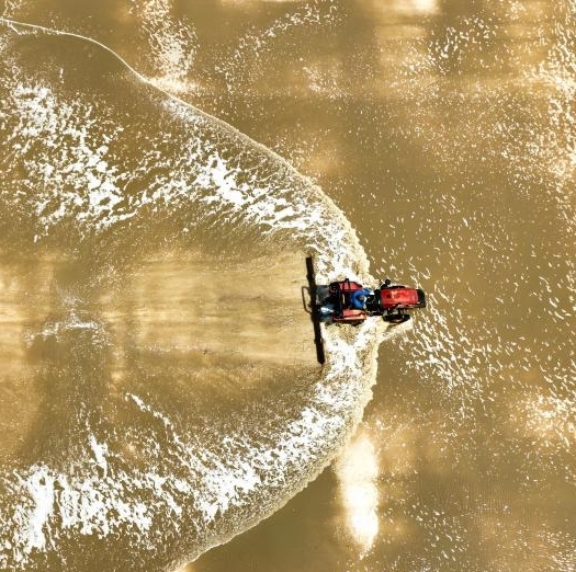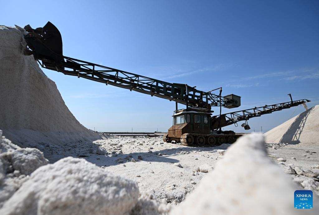 Imagen del 27 de abril de 2025 de una máquina transportando sal cosechada en una salina de Tianjin Changlu Haijing Group Co., Ltd., en Tianjin, en el norte de China. En los últimos días, los trabajadores de Tianjin Changlu Haijing Group Co., Ltd. han estado ocupados recolectando sal en sus 250.000 mu (unas 16.700 hectáreas) de salinas. La cosecha de sal de primavera suele comenzar entre mediados y finales de marzo y junio, dependiendo de las condiciones meteorológicas. (Xinhua/Zhao Zishuo)