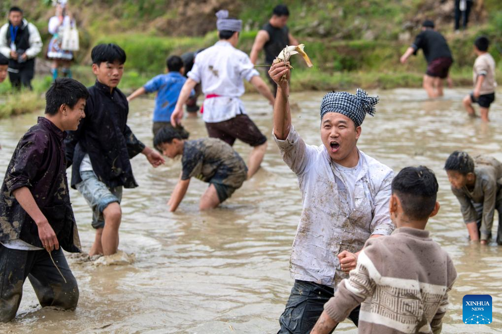 Los aldeanos participan en una actividad de captura de peces durante un evento cultural en terrazas de cultivo en el distrito de Congjiang, provincia suroccidental china de Guizhou, el 26 de abril de 2025. (Foto de Wu Dejun/Xinhua.)