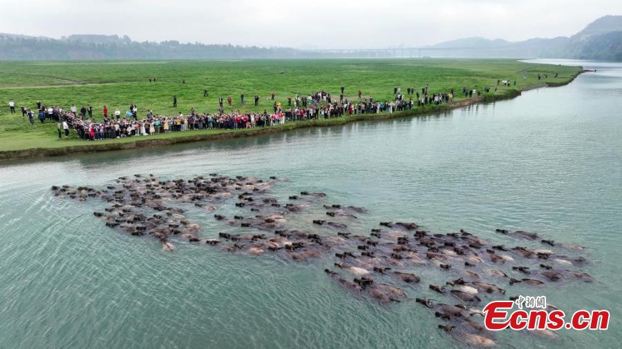 Una manada de búfalos cruza el río Jialing en busca de alimento en la isla de Taiyang, distrito de Peng an, en la provincia suroccidental china de Sichuan, 27 de abril de 2025. (Servicio de Noticias de China/Liu Yonghong)