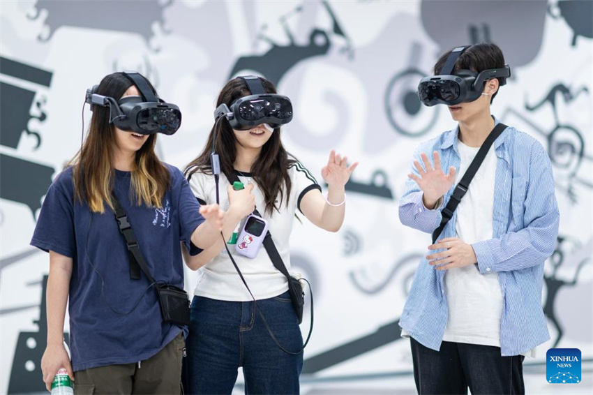 Visitantes participan en la experiencia de RV con artefactos digitales «Odisea de la Edad de Bronce» en Wuhan, provincia central china de Hubei, el 29 de abril de 2025. (Xinhua/Wu Zhizun.)