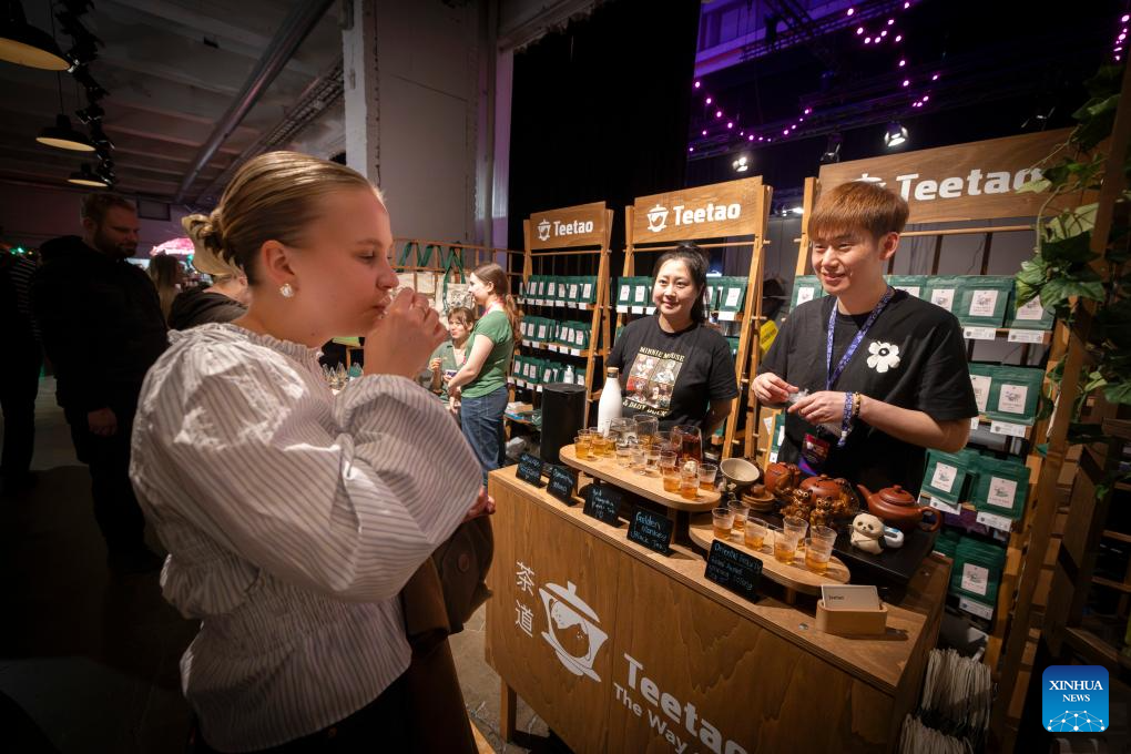 Imagen del 26 de abril de 2025 de una mujer probando bebidas de té exhibidas por un expositor chino durante el Festival del Café de Helsinki 2025, en Helsinki, Finlandia. El Festival del Café de Helsinki 2025 se celebra aquí del 25 al 27 de abril, con unos 60 expositores que muestran sus productos de café, bebidas de té, aparatos de café y una variedad de productos. (Xinhua/Matti Matikainen)