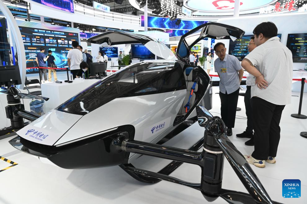 Un grupo de personas observa un dron de pasajeros en la 8.ª Cumbre Digital China en Fuzhou, provincia de Fujian, en el sureste de China, el 29 de abril de 2025. (Xinhua/Lin Shanchuan.)