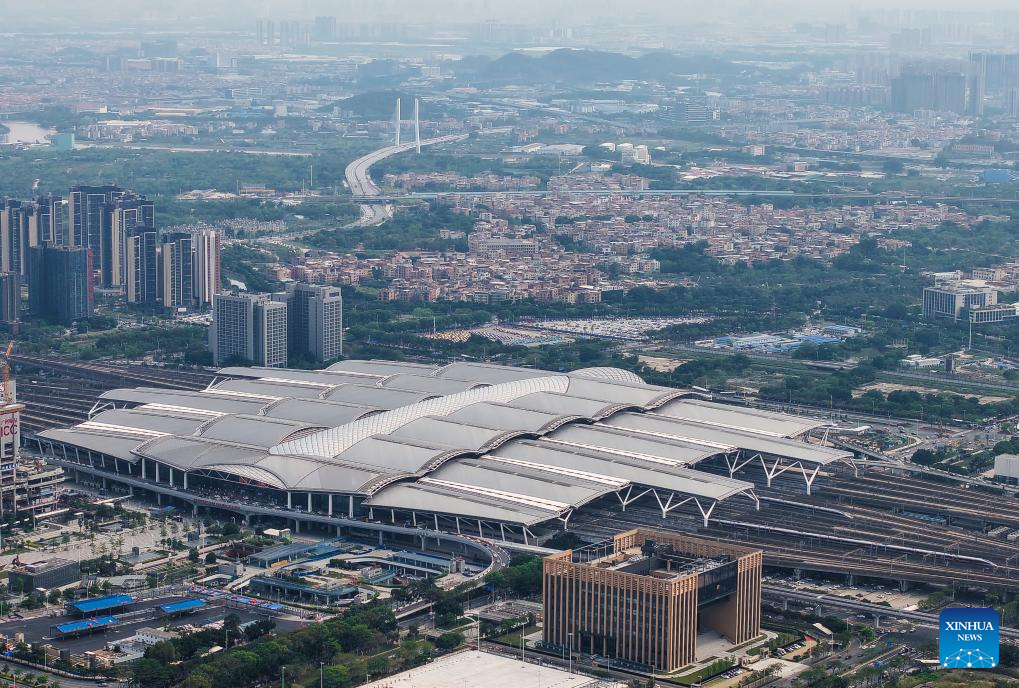 Una fotografía aérea tomada por un dron el 28 de abril de 2025 muestra la estación ferroviaria de Guangzhou Sur, que estará conectada mediante una línea de enlace con la estación ferroviaria de Guangzhou, capital de la provincia meridional china de Guangdong. Recientemente se ha acelerado la construcción de la línea de enlace entre la estación de Guangzhou y la estación de Guangzhou Sur. Tras su finalización, la línea de enlace mejorará la accesibilidad del transporte en la ciudad. (Xinhua/Liu Dawei.)