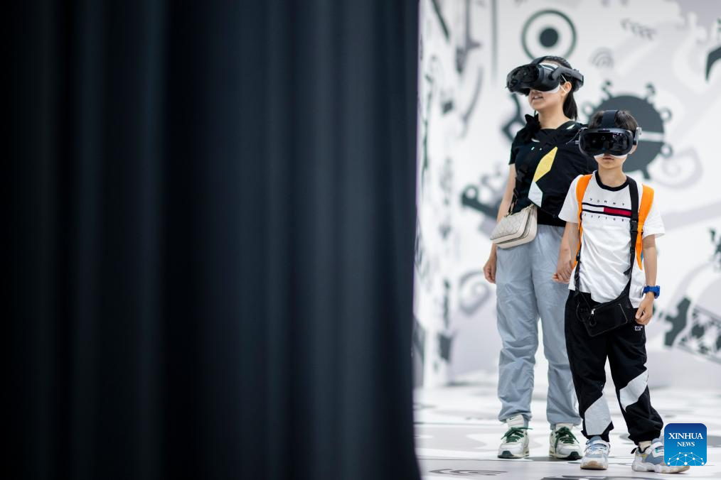 Visitantes participan en la experiencia de realidad virtual de artefactos digitales "Odisea de la Era del Bronce", en Wuhan, en la provincia de Hubei, en el centro de China, el 29 de abril de 2025. El Museo Provincial de Hubei lanzó el martes una experiencia de realidad virtual con artefactos digitales a nivel cinematográfico para conmemorar el 60 aniversario del descubrimiento de la Espada de Goujian, de 2.500 años de antigüedad, que lleva el nombre del rey del estado de Yue durante el Período de Primavera y Otoño (770-476 a.C.). La experiencia de RV, titulada "Odisea de la Era del Bronce", puede acomodar a 100 espectadores simultáneamente en una visualización inmersiva de 30 minutos de los artefactos icónicos del museo, como la Espada de Goujian y el Bianzhong del Marqués Yi de Zeng. (Xinhua/Wu Zhizun)