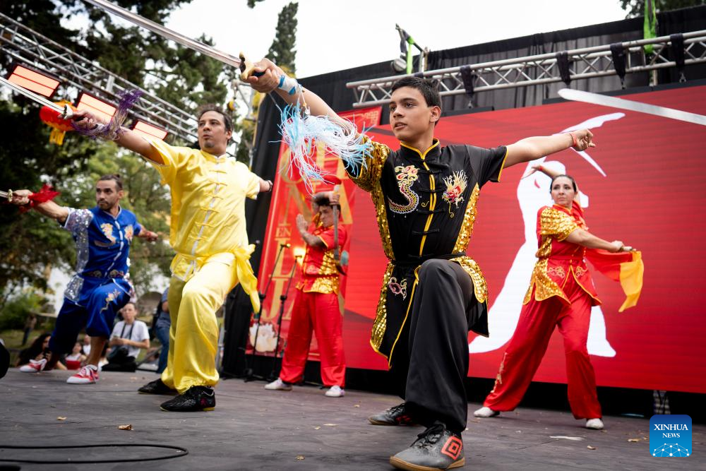 Intérpretes presentan una danza de espadas chinas durante el festival «China en Luján», celebrado en Luján, Argentina, el 4 de mayo de 2025. (Foto de Martin Zabala/Xinhua.)
