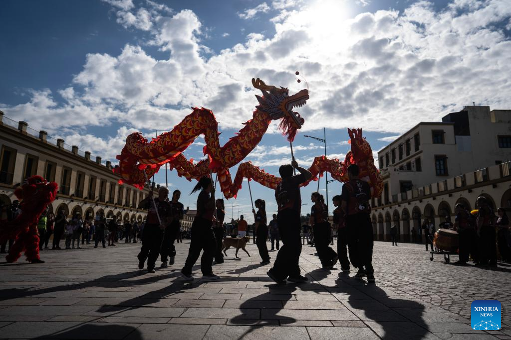 Artistas presentan una danza del dragón durante el festival «China en Luján», celebrado en Luján, Argentina, el 4 de mayo de 2025. (Foto de Martin Zabala/Xinhua.)