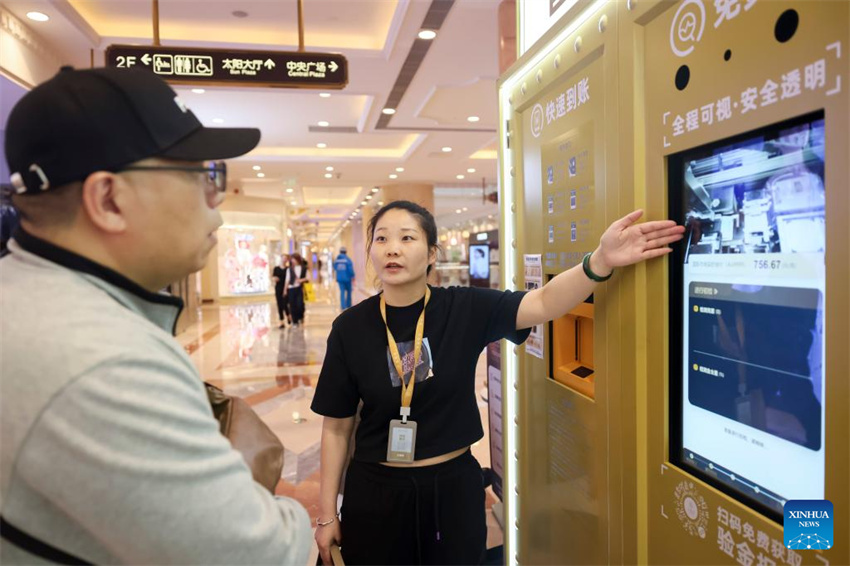 Una empleada presenta una «tienda de oro inteligente» en un centro comercial de Shanghai, este de China, el 5 de mayo de 2025. (Xinhua/Wang Xiang.)