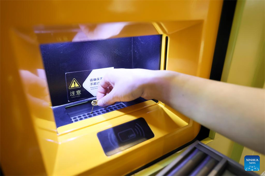 Un miembro del personal coloca joyas de oro en un dispositivo de reciclaje de oro de una «tienda de oro inteligente» en un centro comercial en Shanghai, este de China, el 5 de mayo de 2025. (Xinhua/Wang Xiang.)