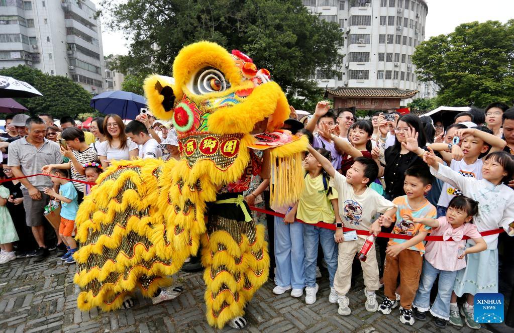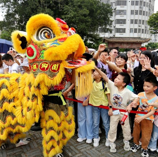 Imagen del 2 de mayo de 2025 de niños interactuando con bailarines de la danza del León en un complejo de turismo y ocio, en la ciudad de Foshan, en la provincia de Guangdong, en el sur de China. Las personas a través de China disfrutan del feriado del Primero de Mayo en curso en diferentes maneras. (Xinhua/Huang Jiming)