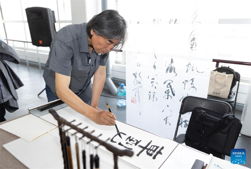 Un calígrafo chino realiza una obra de caligrafía en una exposición de caligrafía china en Ciudad de México, capital de México, el 3 de mayo de 2025. (Xinhua/Li Mengxin.)