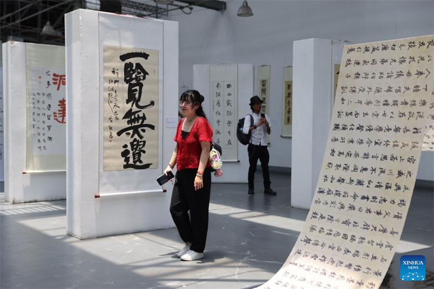 Visitantes admiran obras de caligrafía en una exposición de caligrafía china en Ciudad de México, capital de México, el 3 de mayo de 2025. (Xinhua/Li Mengxin.)