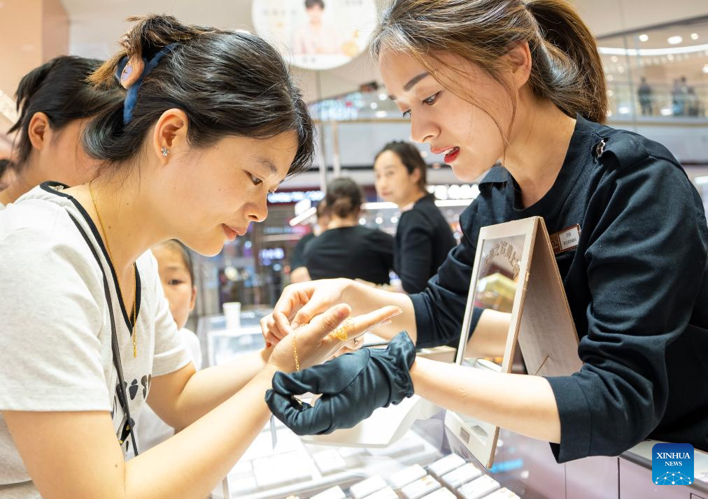 Una clienta (izq.) se prueba joyas de oro en un centro comercial de la ciudad de Nantong, provincia oriental china de Jiangsu, el 3 de mayo de 2025. (Fotografía de Zhai Huiyong/Xinhua.)