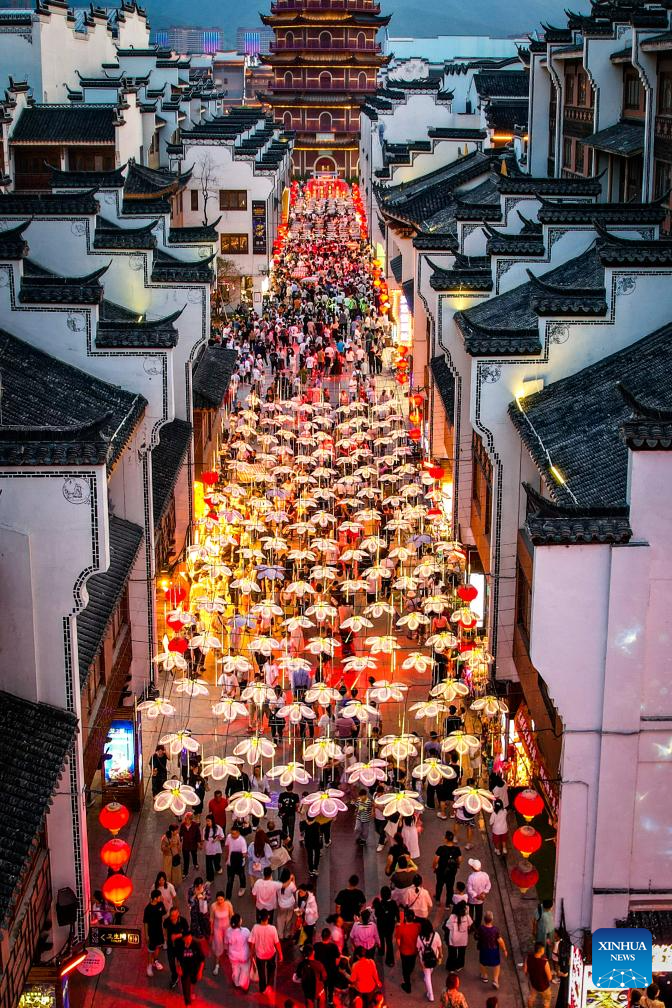 Una foto aérea tomada por un dron el 2 de mayo de 2025 muestra a turistas divirtiéndose en una antigua ciudad en el distrito de Changxing, ciudad de Huzhou, provincia oriental china de Zhejiang. (Fotografía de Wu Zheng/Xinhua.)