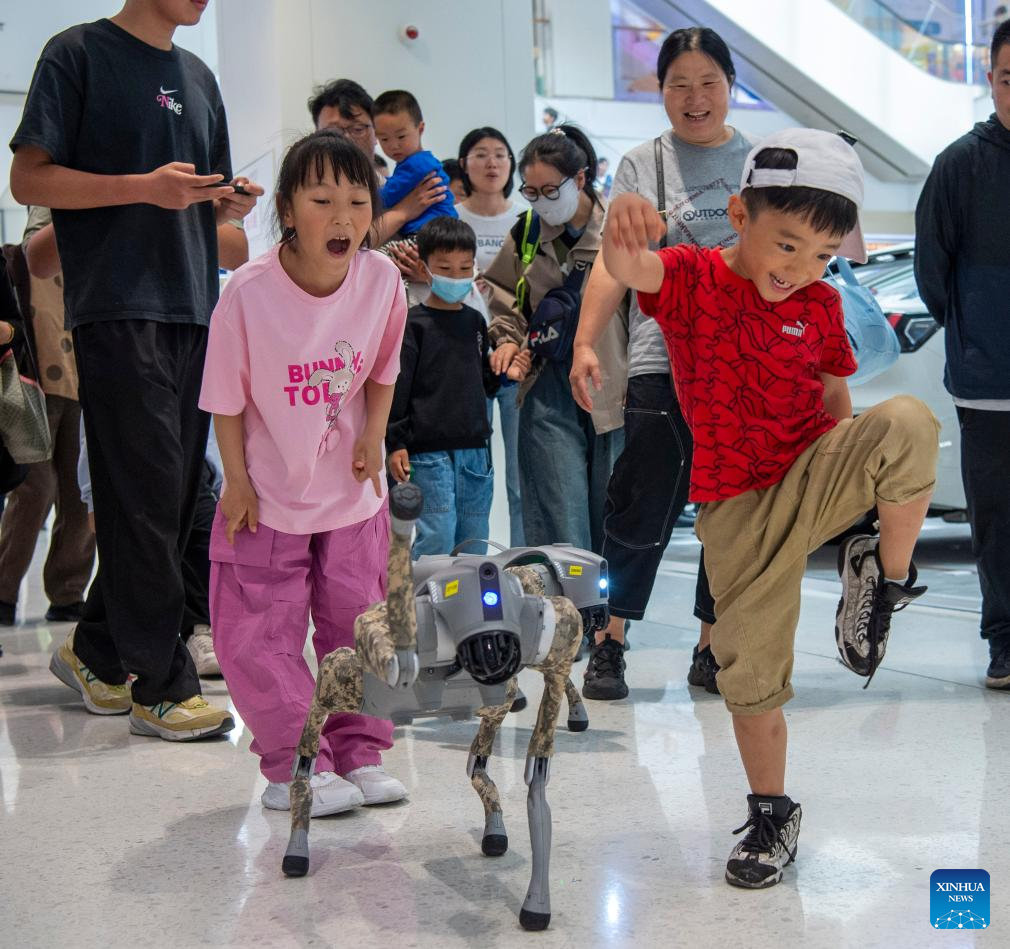 Niños interactúan con un perro robótico en un centro comercial de la ciudad de Hai'an, provincia oriental china de Jiangsu, el 3 de mayo de 2025. (Foto de Xu Jinbai/Xinhua.)