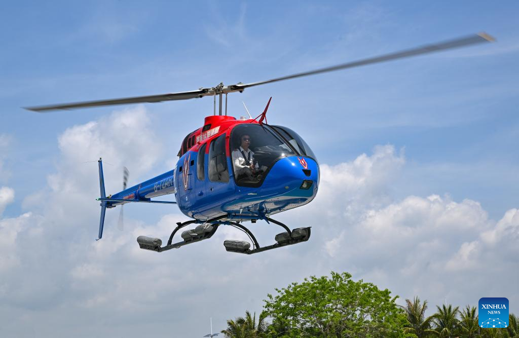 Turistas disfrutan de una excursión en helicóptero en Sanya, provincia meridional china de Hainan, el 3 de mayo de 2025. (Xinhua/Guo Cheng.)