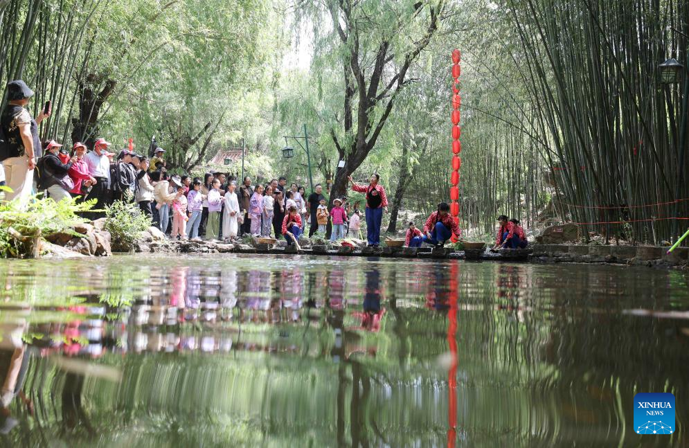 Turistas observan un espectáculo de arte popular en la aldea de Zhuquan, en el distrito de Yinan, ciudad de Linyi, provincia oriental china de Shandong, el 4 de mayo de 2025. (Foto de Wang Yanbing/Xinhua.)