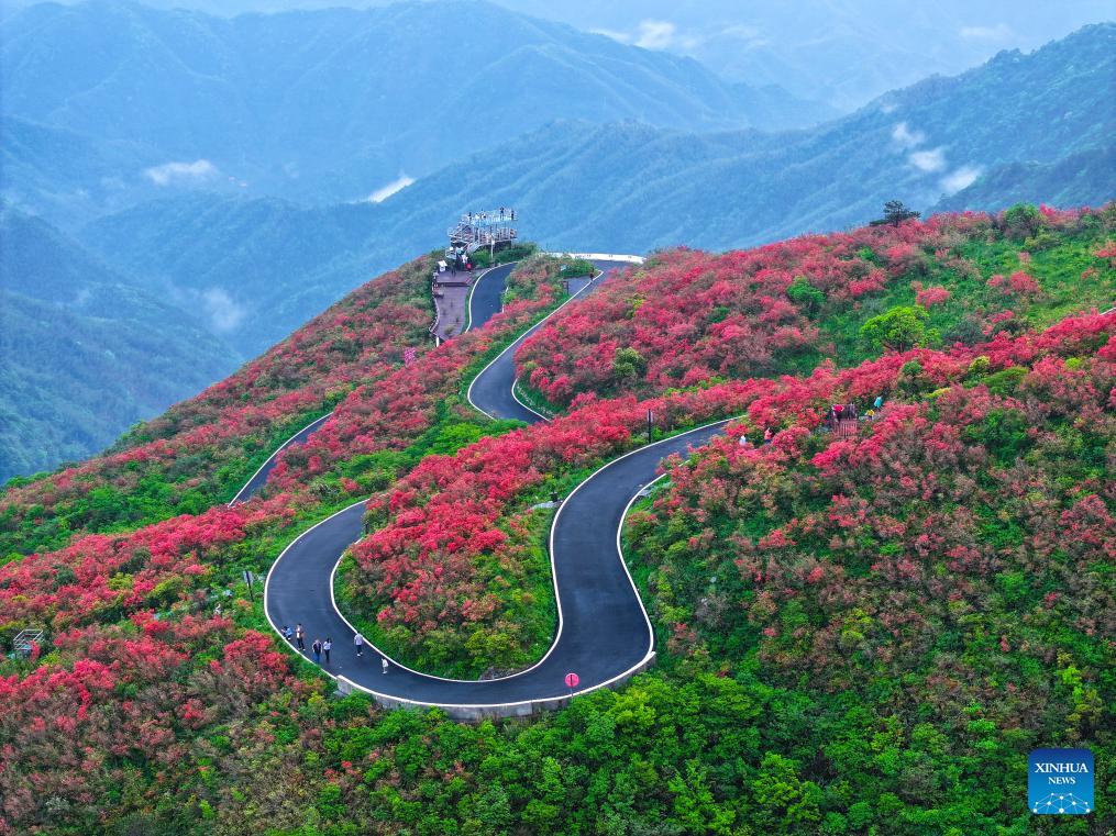 Una foto aérea tomada por un dron el 3 de mayo de 2025 muestra a turistas contemplando flores de azalea en Yongzhou, provincia central china de Hunan. (Fotografía de Zhou Xiuyuchun/Xinhua.)