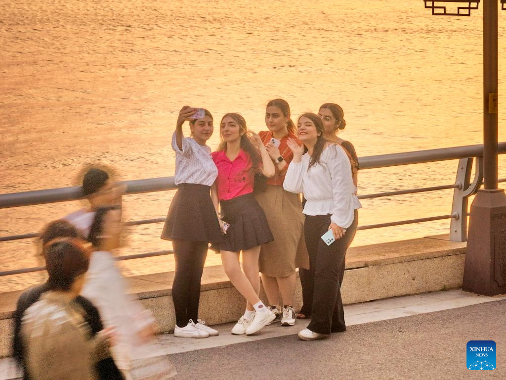 Turistas se toman una selfi junto al lago en la ciudad de Nantong, provincia oriental china de Jiangsu, el 3 de mayo de 2025. (Fotografía de Xu Congjun/Xinhua.)