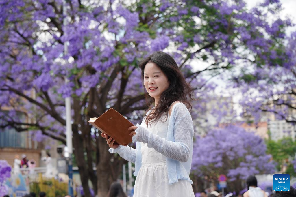 Una joven posa para una foto con jacarandas en flor en Kunming, provincia suroccidental china de Yunnan, el 4 de mayo de 2025. (Xinhua/Gao Yongwei.)