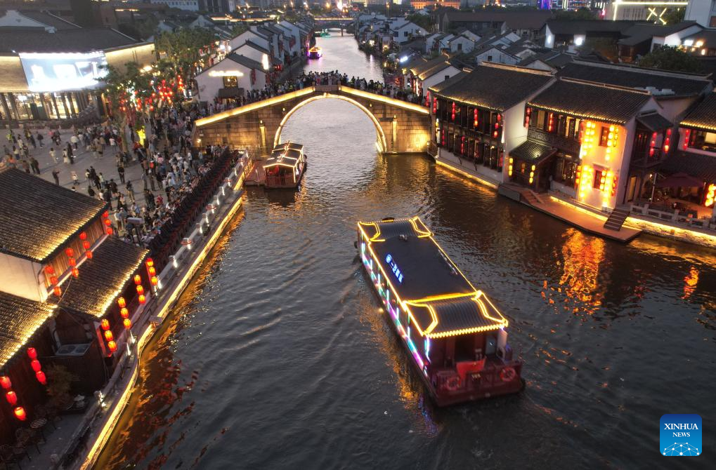 Vista aérea tomada con un dron el 4 de mayo de 2025 de turistas visitando la comunidad histórica del puente Qingming, en Wuxi, en la provincia de Jiangsu, en el este de China. Los viajeros chinos realizaron 314 millones de viajes internos y gastaron 180.300 millones de yuanes (unos 25.000 millones de dólares) del 1 al 5 de mayo, lo que representa incrementos interanuales del 6,4 por ciento y 8 por ciento respectivamente, de acuerdo con cifras oficiales. (Xinhua/Huan Yueliang)