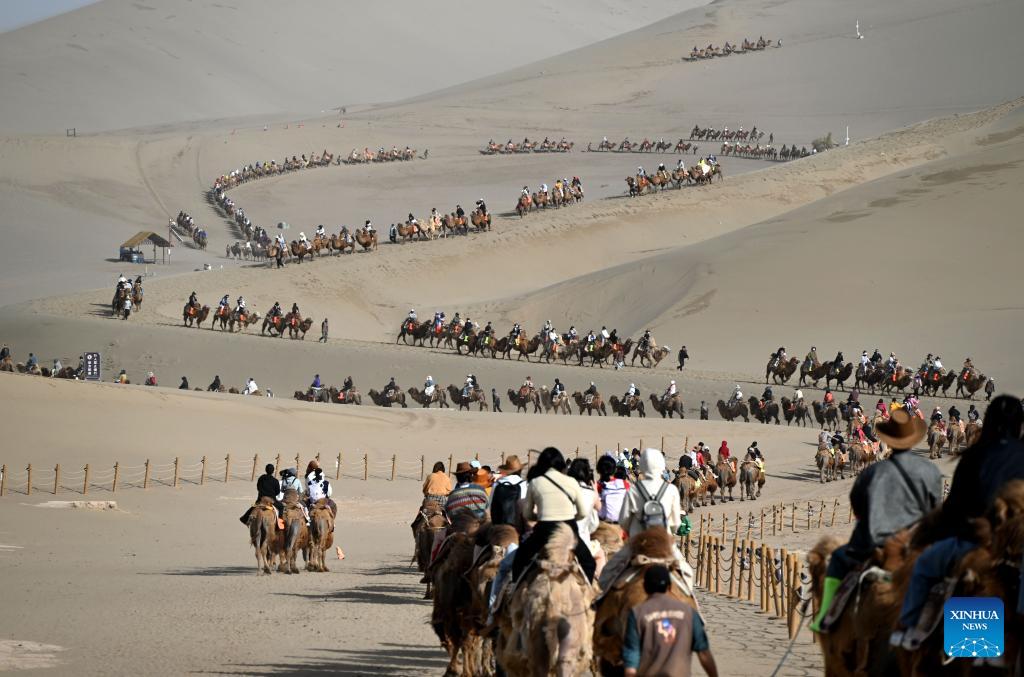 Imagen del 4 de mayo de 2025 de turistas visitando el punto escénico de la Montaña Mingsha y el Manantial de la Luna Creciente, en Dunhuang, en la provincia de Gansu, en el noroeste de China. Durante las vacaciones de cinco días por el Primero de Mayo, los viajeros chinos realizaron unos 314 millones de viajes internos, lo que representa un incremento del 6,4 por ciento respecto al año previo, según cifras publicadas por el Ministerio de Cultura y Turismo. (Xinhua/Zhang Xiaoliang)