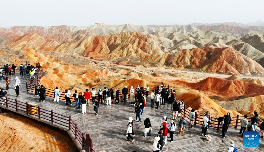 Imagen del 4 de mayo de 2025 de turistas visitando el Parque Nacional Geológico Danxia, en Zhangye, en la provincia de Gansu, en el noroeste de China. Durante las vacaciones de cinco días por el Primero de Mayo, los viajeros chinos realizaron unos 314 millones de viajes internos, lo que representa un incremento del 6,4 por ciento respecto al año previo, según cifras publicadas por el Ministerio de Cultura y Turismo. (Xinhua/Cheng Lin)