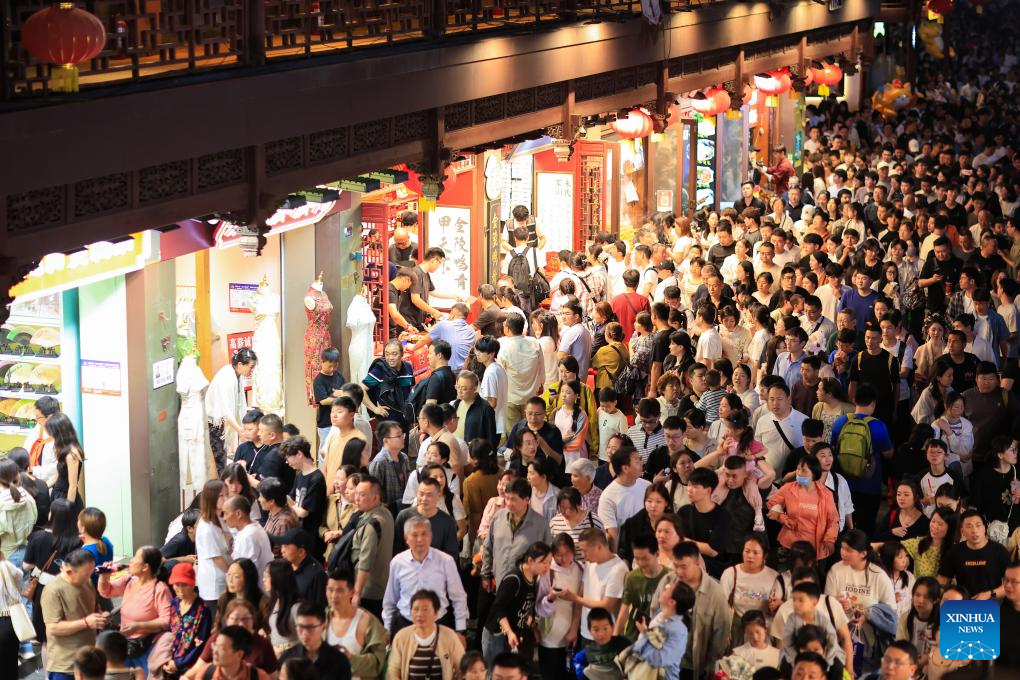 Imagen del 1 de mayo de 2025 de turistas visitando el área escénica del Templo Fuzi (Confucio), en Nanjing, en la provincia de Jiangsu, en el este de China. Los viajeros chinos realizaron 314 millones de viajes internos y gastaron 180.300 millones de yuanes (unos 25.000 millones de dólares) del 1 al 5 de mayo, lo que representa incrementos interanuales del 6,4 por ciento y 8 por ciento respectivamente, de acuerdo con cifras oficiales. (Xinhua/Su Yang)
