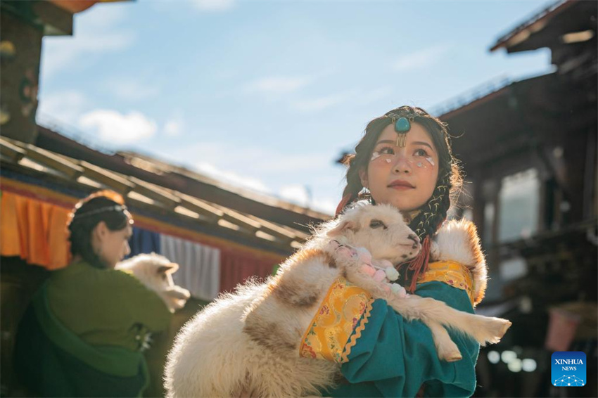 Turistas posan para unas fotos con corderos en la antigua ciudad de Dukezong, en Shangri-La, prefectura autónoma tibetana de Deqen, provincia suroccidental china de Yunnan, el 8 de marzo de 2023. (Xinhua/Hu Chao.)
