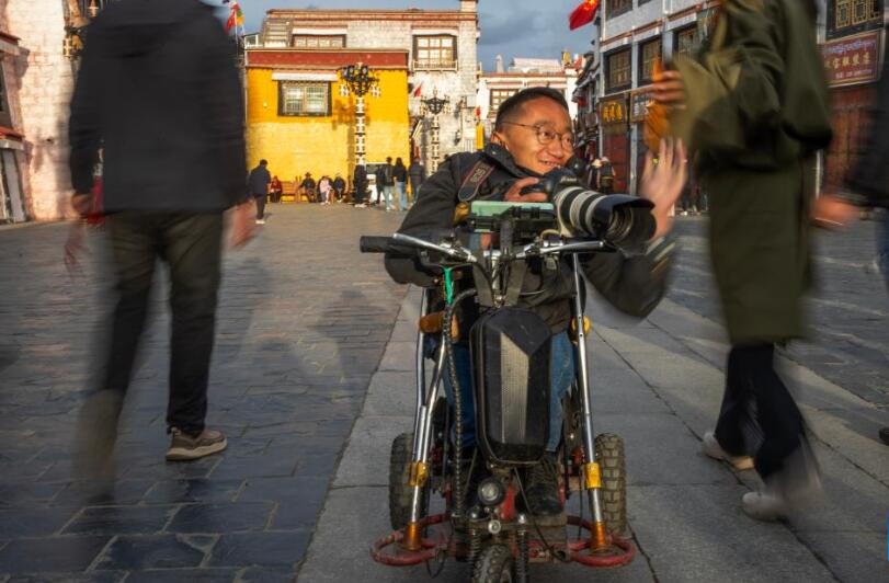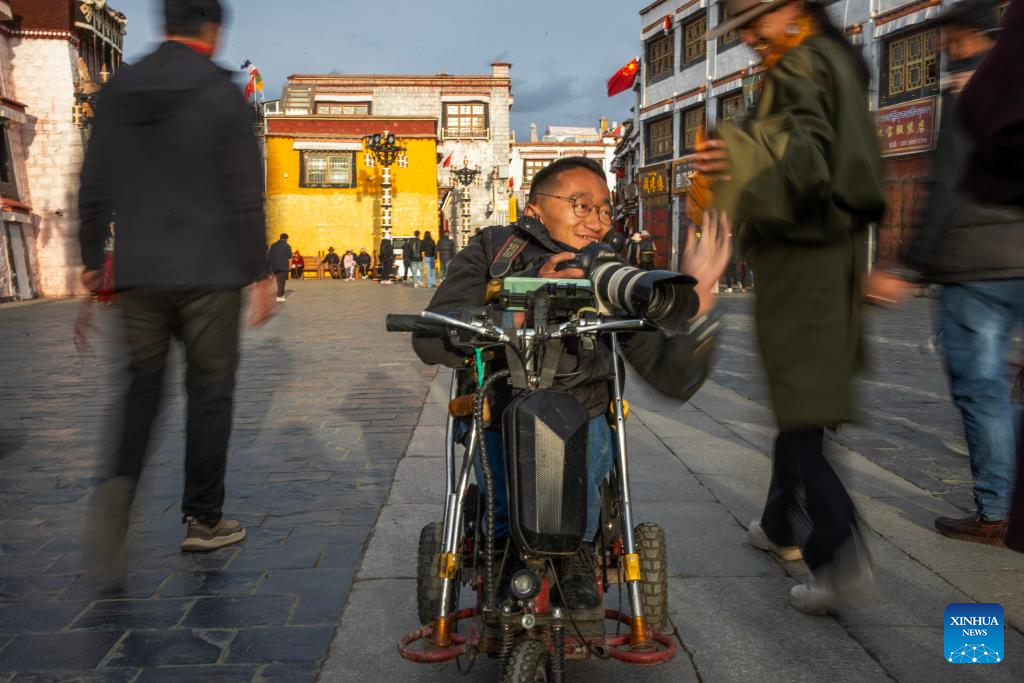 Imagen del 29 de abril de 2025 de Lhapa Dondrup saludando a un amigo mientras toma fotografías en la calle Barkhor, en Lhasa, en la región autónoma de Xizang, en el suroeste de China. Lhapa Dondrup, un hombre de 24 años nacido en Lhasa, padece osteogénesis imperfecta, comúnmente conocida como enfermedad de los huesos de cristal, desde la infancia. Ahora, como adulto, mide menos de un metro de altura y depende de muletas y una silla de ruedas eléctrica para desplazarse. A pesar de estos desafíos, Lhapa alberga el sueño de convertirse en fotógrafo. (Xinhua/Jiang Fan)