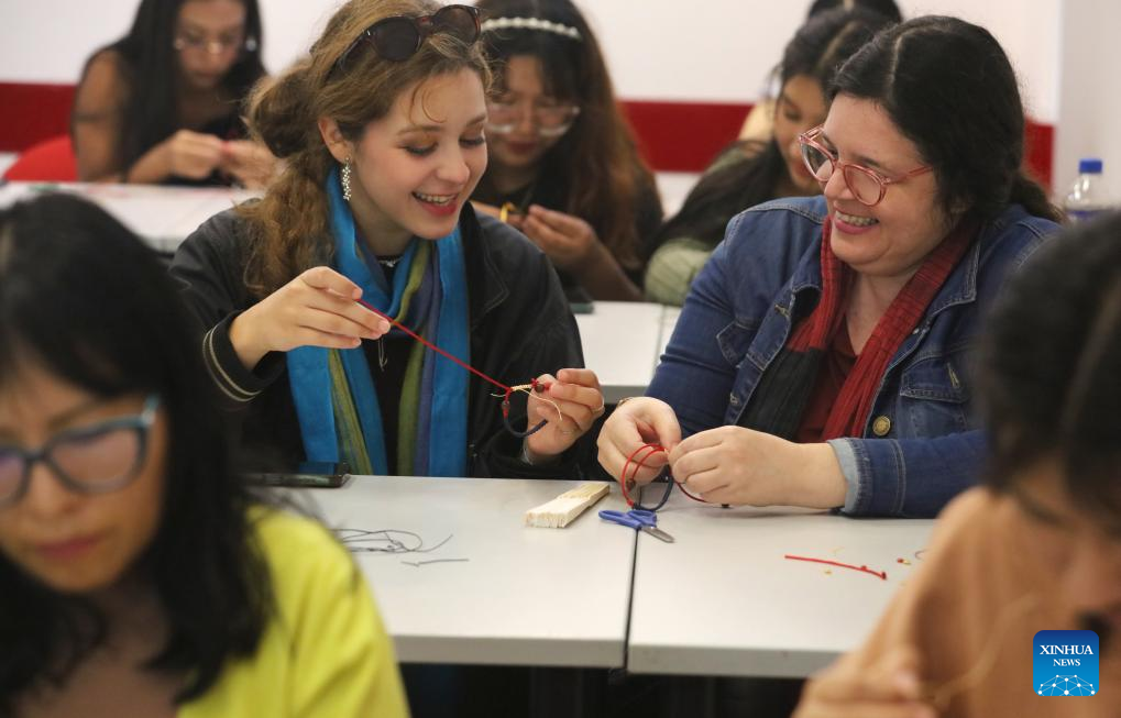Imagen del 5 de mayo de 2025 de alumnas aprendiendo a hacer nudos en el taller "El arte de los nudos chinos" organizado por el Instituto Confucio de la Pontificia Universidad Católica del Perú (PUCP), en Lima, Perú. Peruanos participaron el lunes en el taller "El arte de los nudos chinos", organizado por el Instituto Confucio de la PUCP, para impulsar un mayor acercamiento de los ciudadanos de este país andino a la cultura china. (Xinhua/Mariana Bazo)