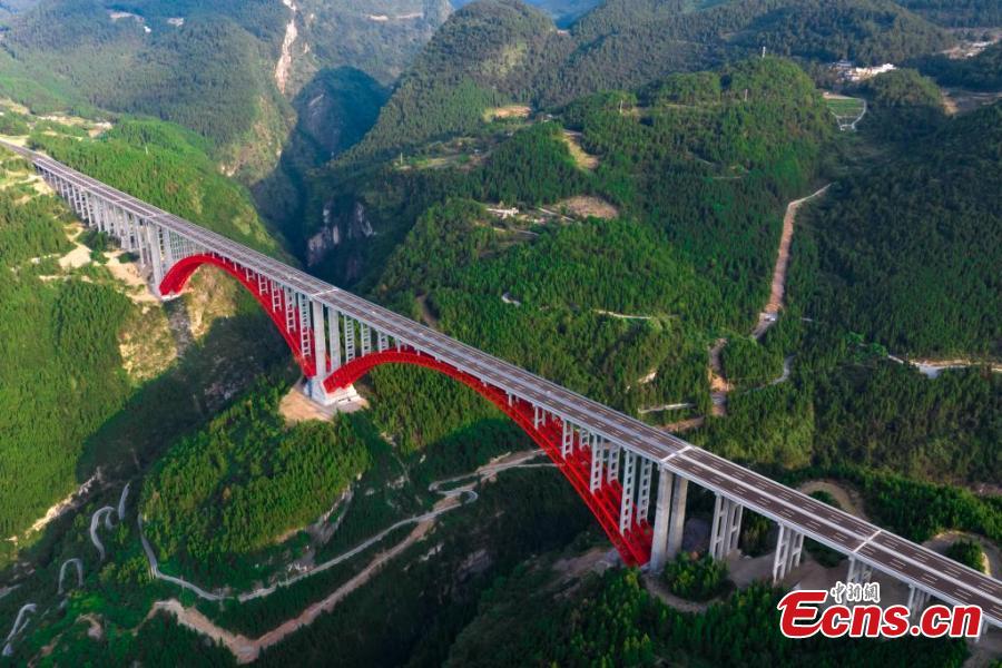Vista aérea del Gran Puente de Shuangbao, el mayor puente de doble arco del mundo, en Chongqing, el 6 de mayo de 2025. (Red de Noticias de China/Wang Jinchuan.)