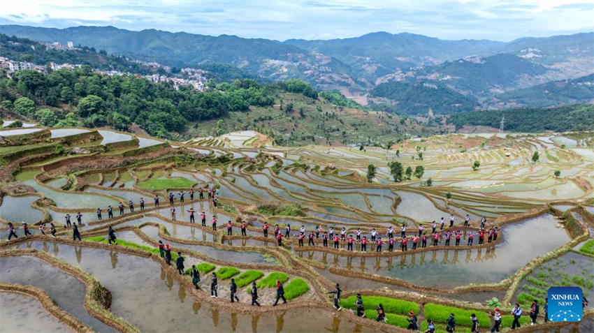 Una foto aérea tomada por un dron el 2 de mayo de 2025 muestra actuaciones durante un evento que marca el inicio de la siembra de arroz en los cultivos en terrazas en la aldea Jiayin del distrito Honghe de la prefectura autónoma de las etnias hani e yi de Honghe, provincia suroccidental china de Yunnan. (Xinhua/Hu Chao.)