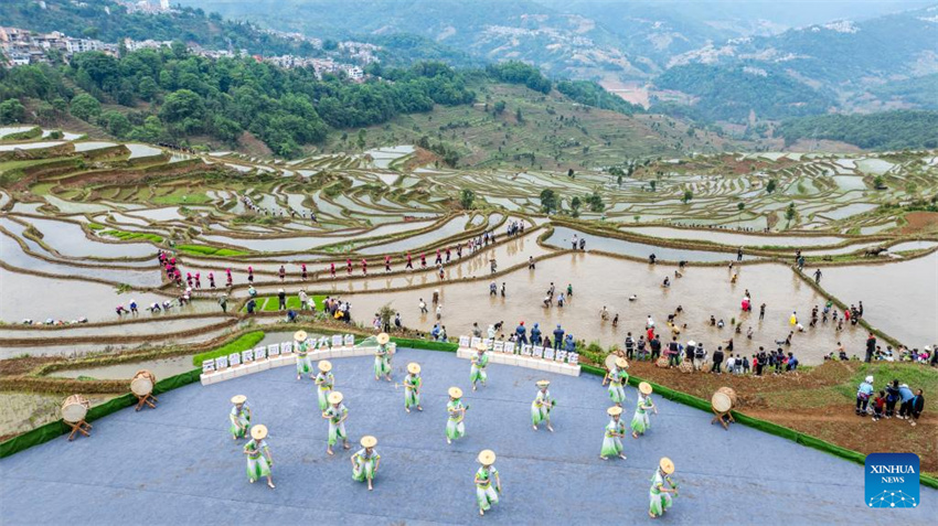 Una foto aérea tomada por un dron el 2 de mayo de 2025 muestra las actuaciones durante un evento que marca el inicio de la siembra de arroz en los campos en terrazas de la aldea Jiayin del distrito de Honghe de la prefectura autónoma de las etnias hani e yi de Honghe, en la provincia suroccidental china de Yunnan. (Xinhua/Hu Chao.)