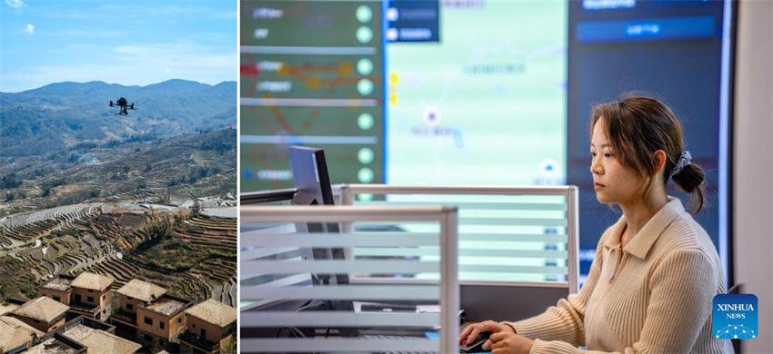 Esta foto combinada muestra un dron realizando misiones de patrullaje (izq., foto del dron), y un miembro del personal de la oficina de gestión del patrimonio mundial de las Terrazas de Arroz de Honghe operando drones para realizar misiones de patrullaje (dcha.), en el distrito de Yuanyang de la prefectura autónoma de de las etnias hani e yi de Honghe, provincia suroccidental china de Yunnan, el 28 de febrero de 2025. (Xinhua/Hu Chao.)