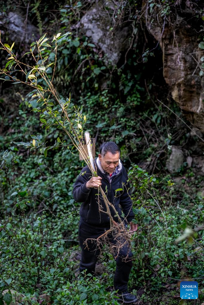 Un guardabosques se dirige a las montañas para plantar árboles en la aldea Azheke del distrito Yuanyang de la prefectura autónoma de las etnias hani e yi de Honghe, provincia suroccidental china de Yunnan, el 27 de febrero de 2025. (Xinhua/Hu Chao.)